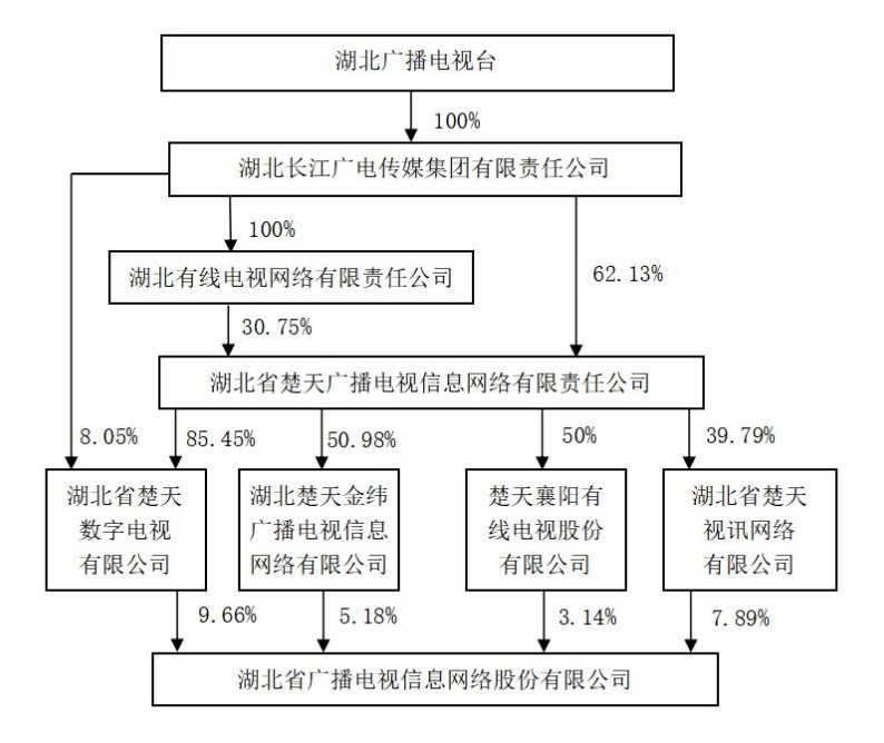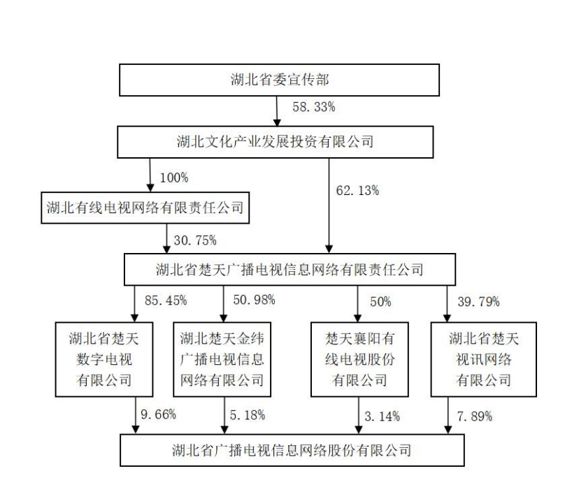 昨晚,湖北廣電網(wǎng)絡(luò)發(fā)布公告稱(chēng),公司于11月17日收到湖北廣播電視臺(tái)通知,其將通過(guò)全資子公司長(zhǎng)江廣電集團(tuán),把持有的楚天網(wǎng)絡(luò)62.1289%股權(quán),以及另一全資子公司湖北有線電視網(wǎng)絡(luò)有限責(zé)任公司100%股權(quán)(后者持有楚天網(wǎng)絡(luò)30.7458%股權(quán)),一并無(wú)償劃轉(zhuǎn)至湖北文化產(chǎn)業(yè)發(fā)展投資有限公司(簡(jiǎn)稱(chēng)“湖北文投”)。