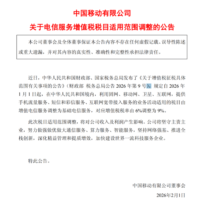 2月1日,中國移動、中國電信及中國聯(lián)通三大電信運(yùn)營商相繼發(fā)布了《關(guān)于增值稅征稅具體范圍有關(guān)事項(xiàng)的公告》(財政部 稅務(wù)總局公告2026年第9號,以下簡稱《公告》)。《公告》規(guī)定自2026年1月1日起,在中華人民共和國境內(nèi),利用固網(wǎng)、移動網(wǎng)、衛(wèi)星、互聯(lián)網(wǎng),提供手機(jī)流量服務(wù)、短信和彩信服務(wù)、互聯(lián)網(wǎng)寬帶接入服務(wù)的業(yè)務(wù)活動適用的稅目由增值電信服務(wù)調(diào)整為基礎(chǔ)電信服務(wù),對應(yīng)增值稅稅率由6%調(diào)整為9%。