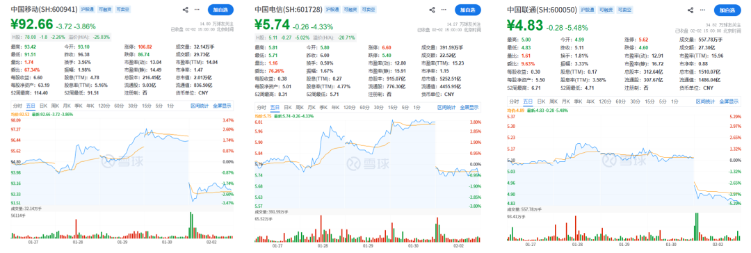 今日資本市場以腳投票,三大運(yùn)營商全線走低。截至收盤,A股方面,中國移動跌3.86%,中國電信跌4.33%,中國聯(lián)通跌5.48%;港股方面,中國移動跌2.66%,中國電信跌5.02%,中國聯(lián)通跌6.29%。板塊跌幅顯著跑輸大盤,反映投資者對利潤侵蝕的深度擔(dān)憂。