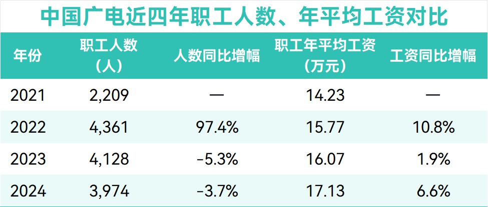 近四年來,中國廣電職工平均工資穩(wěn)步增長。據(jù)國家廣播電視總局統(tǒng)一披露的直屬企業(yè)工資信息數(shù)據(jù),中國廣電的年平均工資從2021年的14.23萬元增至2024年的17.13萬元,累計漲幅達20.38%。