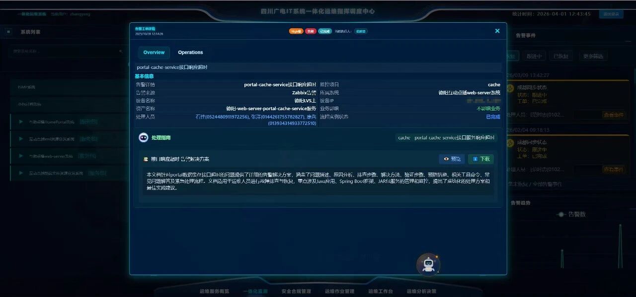 “?!敝袊鴱V電四川公司的智能運維中心大屏上,一條關于數(shù)據(jù)緩存服務的隱患告警突然彈出:“portal-cache-service 接口響應超時隱患”。值班工程師石佳迅速點開告警詳情,屏幕上清晰顯示故障服務器信息和IP地址,平臺內置知識庫自動同步推送了“接口超時排查及處置方案”。無需翻閱文檔,石佳一鍵發(fā)起遠程視頻協(xié)作,后臺人工智能模型和技術專家張洋迅速接入,快速定位問題并完成調整。僅兩分鐘,服務隱患自動恢復正常,告警自動消除、工單同步辦結、故障知識庫自動投喂?!耙郧疤幚磉@類隱藏極深的接口卡頓隱患,要定期查日志、查文檔、聯(lián)現(xiàn)場,甚至請專家親自跑一趟才能定位,耗時費力。現(xiàn)在我們‘救火隊員’也有了自動7x24小時‘智能守護者’,效率可高多了?!笔迅锌?。