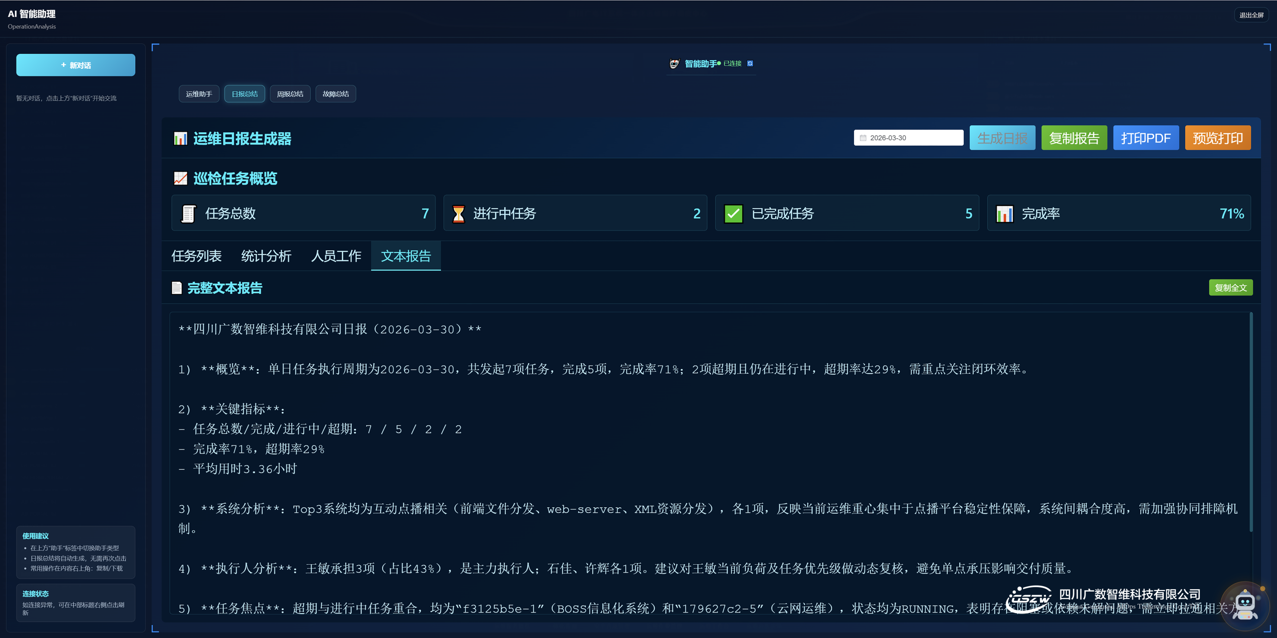 平臺還深度集成企業(yè)內部協(xié)作工具,告警工單自動推送,視頻遠程調度支持,7×24小時智能問答助手隨時提供排查指引,報告助手自動輸出結構化運維報告,不僅使故障處理效率提升50%以上,更能助力管理者科學決策、精準調度,為保障全省用戶穩(wěn)定收視提供堅實支撐。